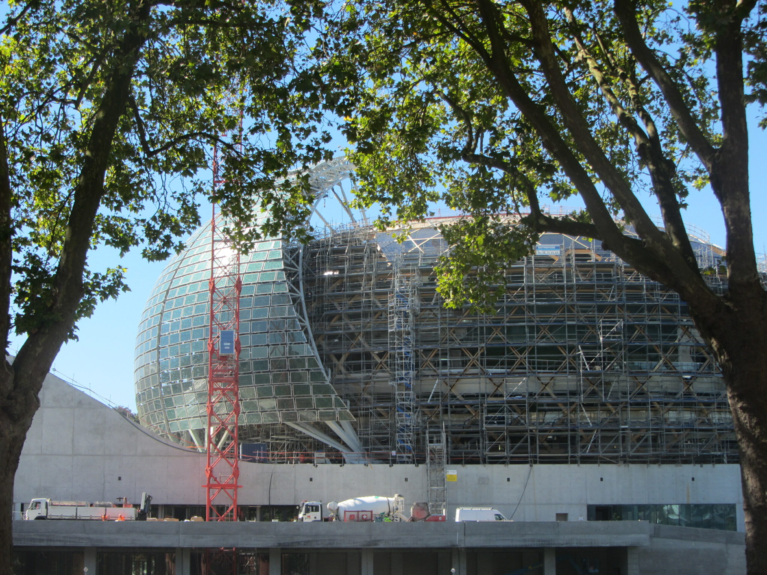 Les premiers éléments de la Voile solaire de l’auditorium ont été mis en place. Son architecture et ses courbes se mélangent sur la pointe aval de l’île Seguin et répond parfaitement à la beauté du lieu. Elle semble surgir et flotter sur un miroir d’eau. Sa grande voile est revêtue de plus de 1000 m² de panneaux solaires photovoltaïques, qui suivront la course du soleil autour de l’auditorium. En balcon sur la Seine, le site deviendra également un lieu de promenade ouvert à tous. Sur la toiture de la grande salle, la charpente métallique se termine et le jardin prend forme. Les fosses d’arbres ont été coulées et accueilleront des arbres de grande envergure d’espèce différente. An niveau du parvis, 32 vitrages de la porte monumentale ont été posés. Cet exemplaire unique au monde de 11 m de large, 10,50 de haut et pesant près de 5 tonnes fonctionnera grâce à une centrale hydraulique, la pose de la structure porteuse de l’écran est en cours.