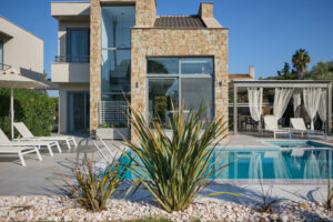 Proche des merveilleuses plages de la région de Chalcidique avec leurs eaux cristallines, l'Eco-Villa Pallini est située au Nord de la Grèce en Macédoine, superficie de 100 m² avec 4 chambres et 3 salles de douche, vol direct par Thessalonique. L'installation de panneaux solaires permettent une consommation d'électricité verte et l'utilisation des pierres locales a été privilégiée avec une isolation thermique par l'extérieur. Egalement des enduits écologiques intérieurs ont été posés ainsi que des matelas en fibres de coco pour prévenir l'impact allergique et optimiser le confort des occupants.
